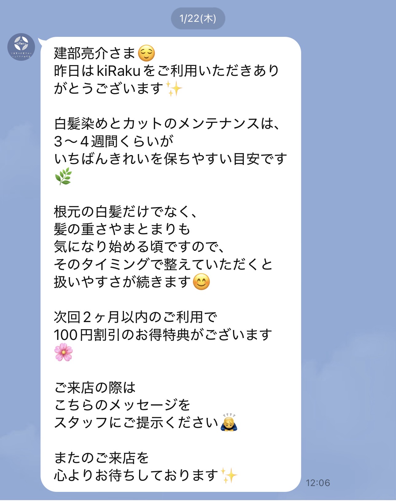 公式LINE登録されてたお客様には「2ヶ月以内のご利用で割引」という特権があります。